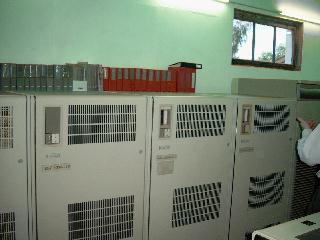 Das nächste Bild zeigt einen Blick in den Gang, in welchem die Mehrzahl der VAX-Systeme aufgestellt ist. Auf der rechten Seite finden sich drei VAX-7000 Systeme, vier VAX-6000, von denen eine einen Vektorcoprozessor besitzt, eine VAX-8350, ein SC008 Sternkoppler, ein HSC70 und ein HSC95 Plattencontroller sowie zwei SW800 Plattenschränke. Auf der anderen Gangseite befinden sich mehrere Racks mit RA-Platten (SDI-Bus), eine VAX-11/750 mit RM80 Plattenlaufwerk sowie einige Micro-VAX-Systeme. | The following picture shows most of the VAX-systems in the museum (apart from those running at home or stored in the cellar). On the right side are three VAX-7000 systems, four VAX-6000 systems (one of which has a vector coprocessor), a VAX-8350, a SC008 starcoupler, HSC70 and HSC95 disk and tape controllers and two SW800 storage racks. On the other side are some racks with RA disk drives (SDI bus), a VAX-11/750 with RM80 disk drive and some micro-VAX systems. |