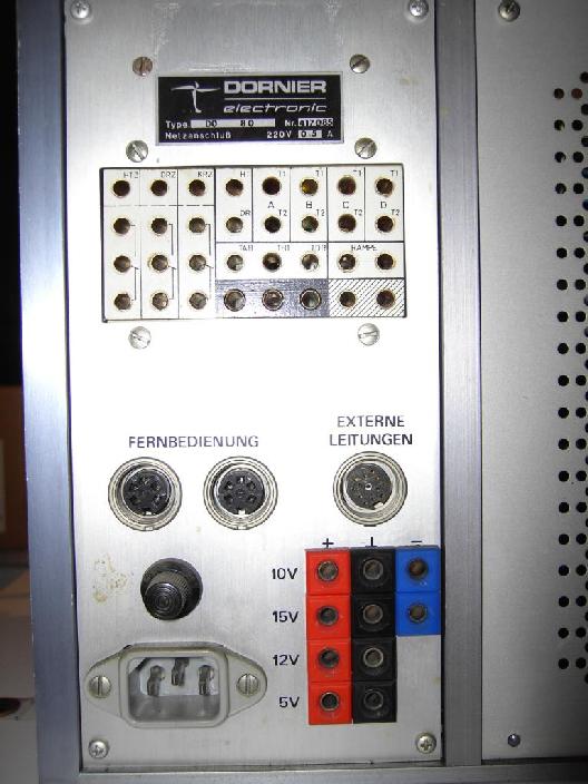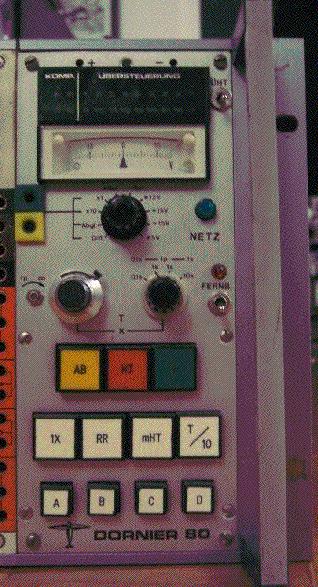 The picture on the right shows the more modern variant of the operator control panel which is more or less identical to the older version apart from the fact that a digital four digit voltmeter is used instead of the former compensation voltmeter. Note: When you ever encounter weird readings on this digital instrument be sure to check the +5 V supply for ripple and for correct setting. The voltmeter is quite sensitive to this! |