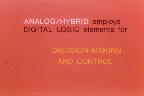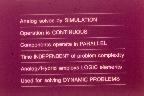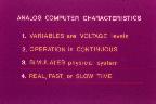Electronic Associates Inc., EAI for short, created a multimedia course titles "Understanding the ANALOG/HYBRID Computer" which gave a concise introduction into the art of analog and hybrid computing. The following pictures are the 80 slides from this multimedia lecture. I will convert the accompanying audiotape as soon as possible and make it available here, too. Every slide links to a large version of it - the quality is suboptimal, as I know. This is caused first by the old age of the slides and second by the fact the the slides are framed and the scanner I used has a very short focal depth. If you are interested in all slides in maximum resolution you can download them here as a 17 MB ZIP-file. Podcast version: Thanks to my friend Christian Peters who worked hard for several hours this EAI lecture is now available as podcast including audio and synchronized video (slides :-) ). It has been tested with several players on MAC-OS computers and even on Windows systems. This podcast is available here (about 17 MB).