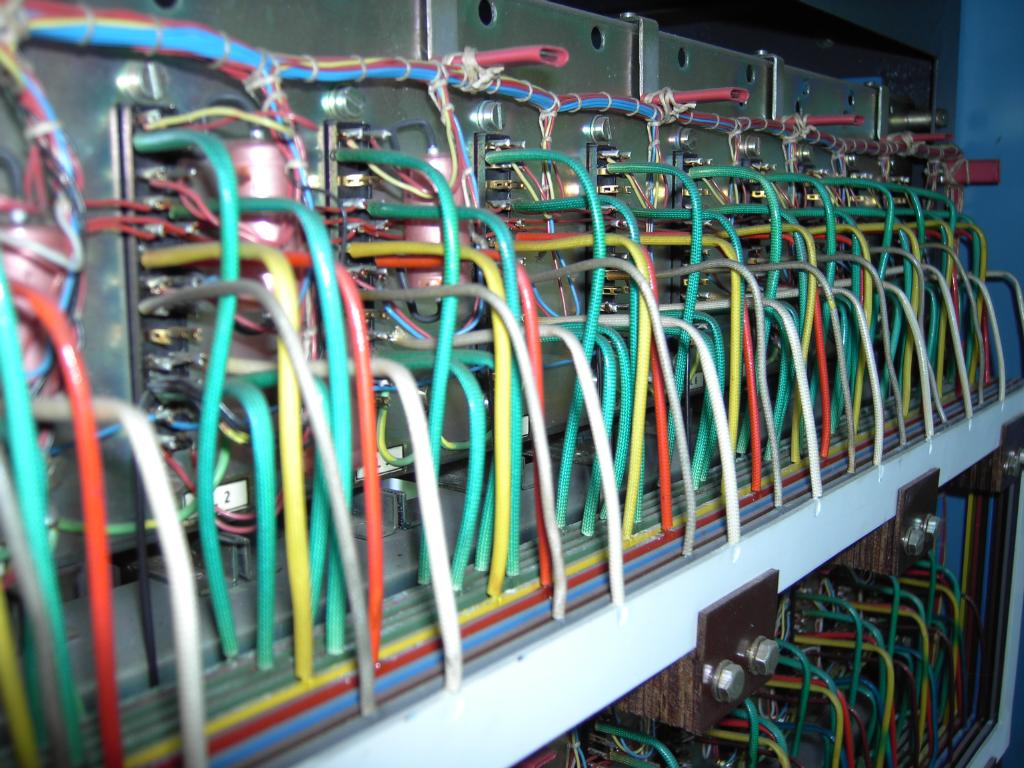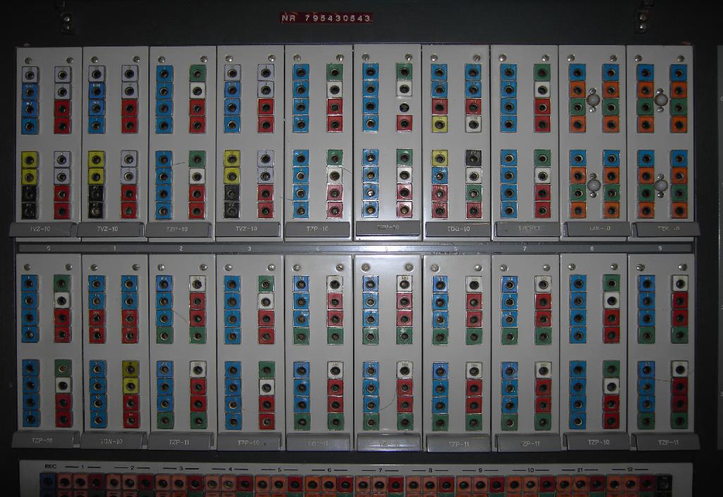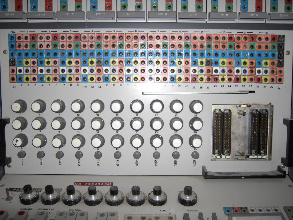 The picture below shows a removable patch panel for this system. This panel can be hooked to the front of the analog computer and connects to the 4 mm jacks of the modules by means of very fragile spring contacts. The front plates can be removed for easy accomodation of different computer configurations. |