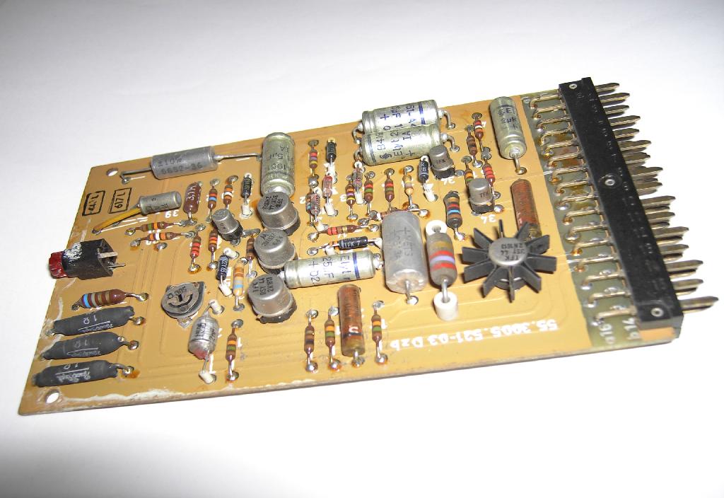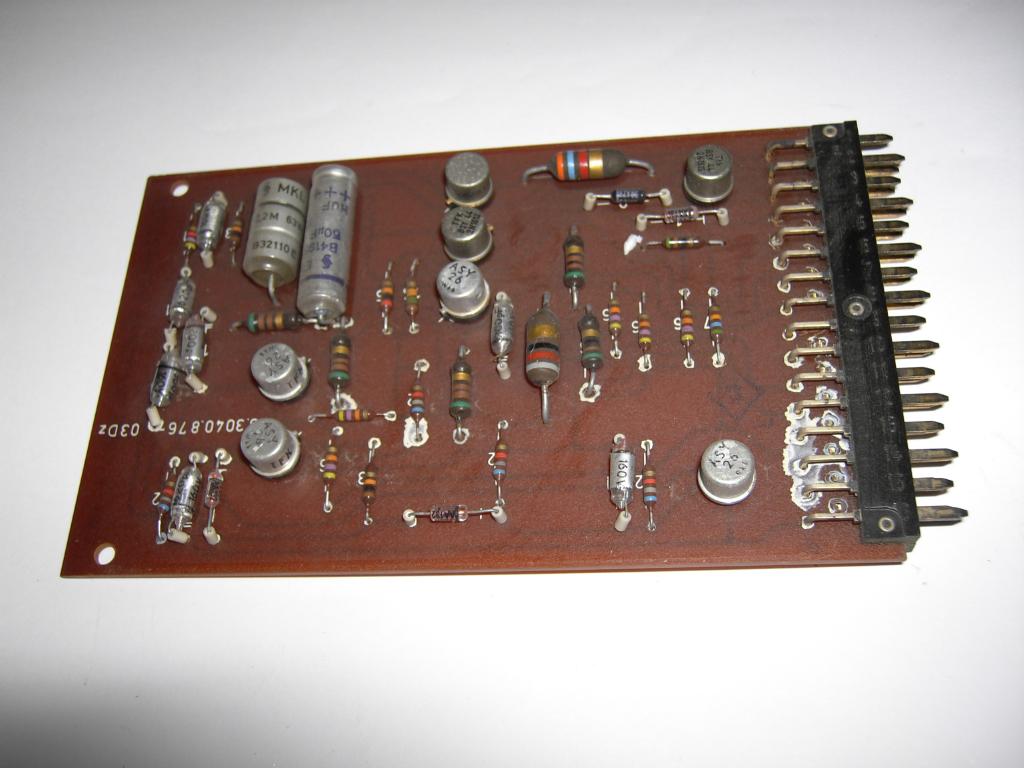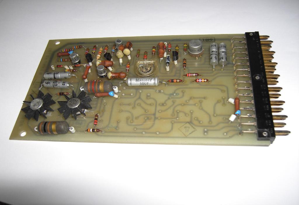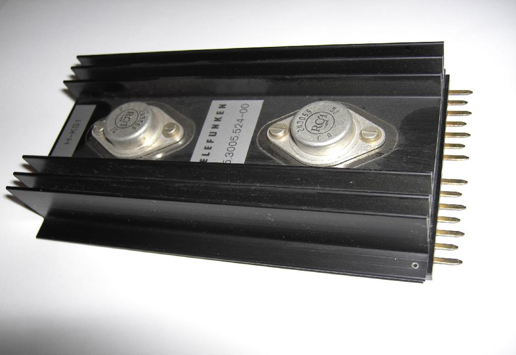 The two following pictures show one of the two (identical) voltage regulator cards for the +/-15 V power supply and the two power transistors mounted on a common cooling bracket (on the right). |