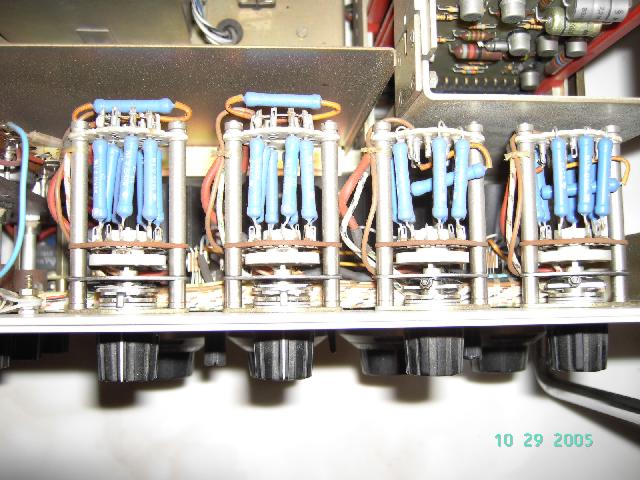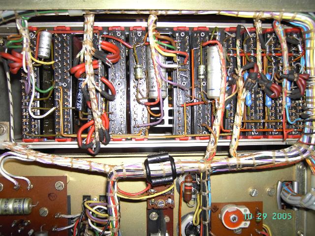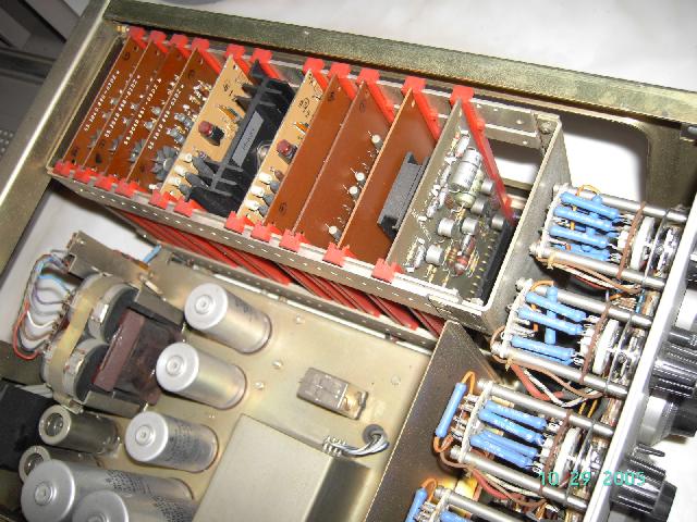 Detailed pictures: The picture on the left below shows the precision resistors used to select the desired amplification rate for the deflection circuits. The picture on the right shows the card cage containing the printed circuit cards for the amplifiers and power stages. |