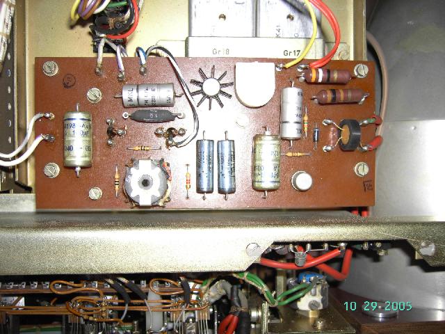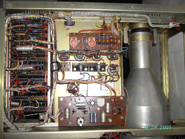The picture on the left shows the cabling of the amplifier section while the picture on the right shows the high voltage oscillator which generates the acceleration voltage for the electron beam tube with a fly back transformer. |