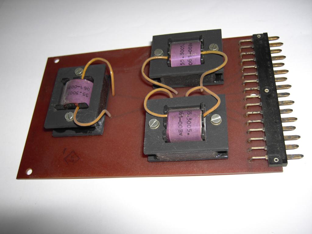 The next two pictures below show one of the four operational amplifiers used for the two X- and two Y-inputs (on the left) and the coil-unit used to decouple the +/-15 and +55 V power supply outputs (on the right). |