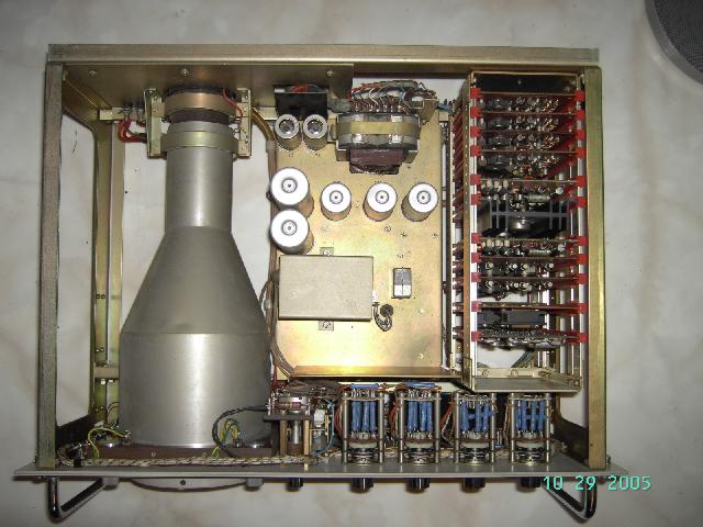 The overall system: The pictures below show the top and bottom view of the overal oscilloscope. On the one side the electron beam tube can be seen in its MU-metal shielding, in the middle is the power supply and on the other side are the chopper stabilized operational amplifiers for the x- and y-deflection of the beam(s). |