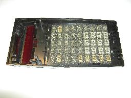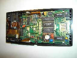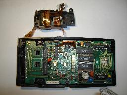 The picture on the left shows the interior of the calculator with the card reader/writer removed. Be careful not to bend the flexible connection wires when disconnecting them - this is a delicate procedure and requires some patience. :-) The row of soldering points on the far left connects the 12 digit display with the main printed circuit board. |