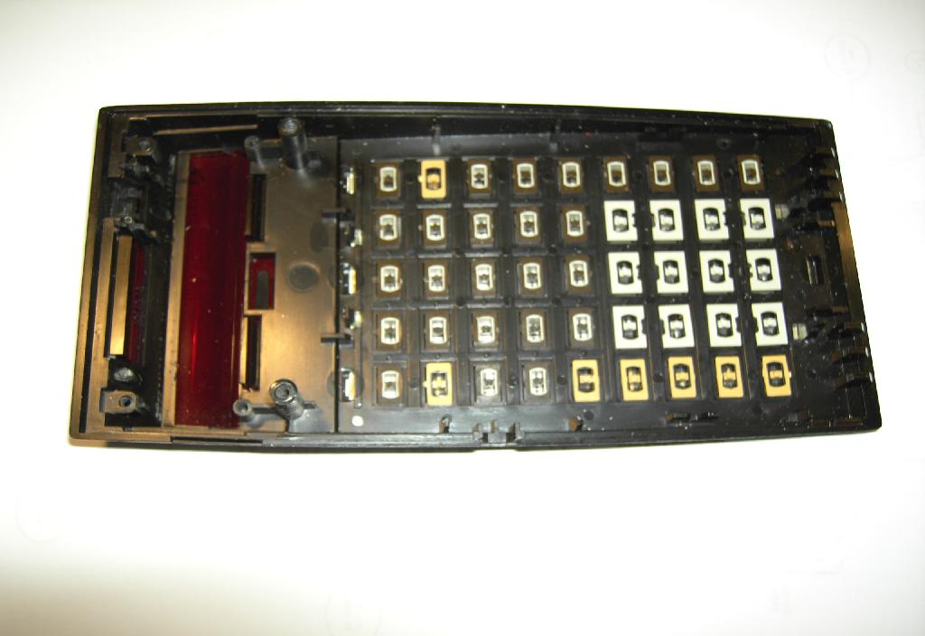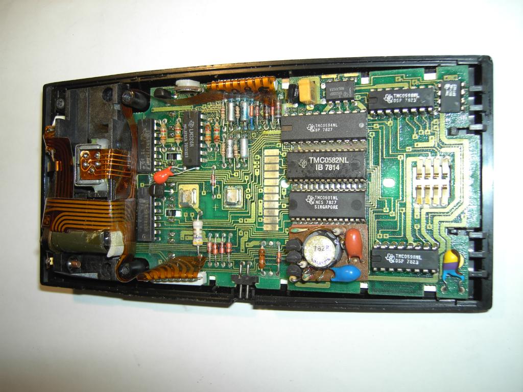 The picture on the right shows the interior of the calculator. (Note the blue discoloration due to debris from the deteriorated battery pack! These residues can be conductive and can cause all kind of trouble, so you have to carefully remove them.) |