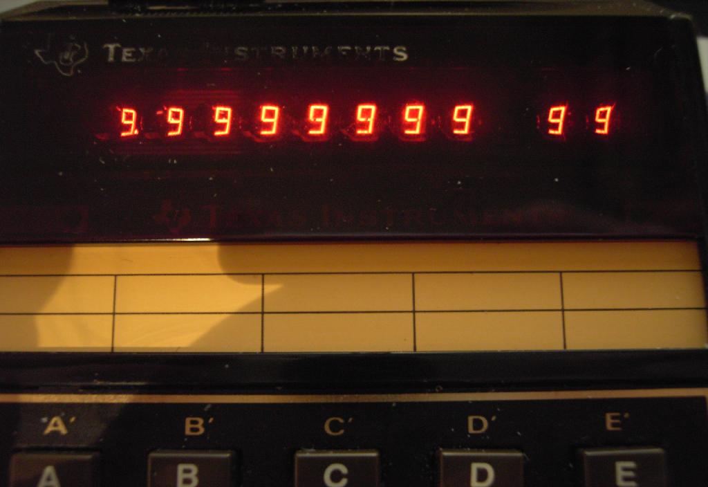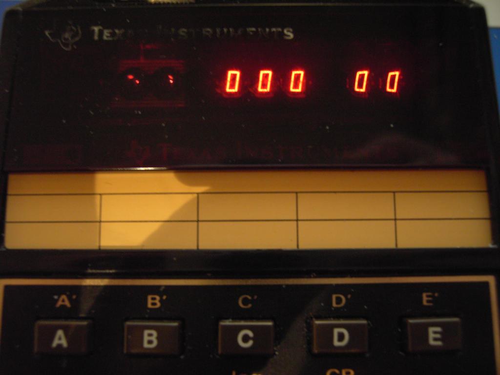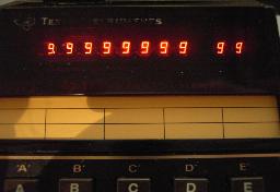 The TI-59 is the most powerful calculator having a LED seven segment display - all of its more powerful successors came with LC displays. The display of the TI-59 consists of 12 digits of which 10 are used to display a number (the internal precision is 13 digits). The leftmost digit displays a stylized "C" (as an abbreviation for "Calculating") when the calculator is actually performing a calculation. | |||||||