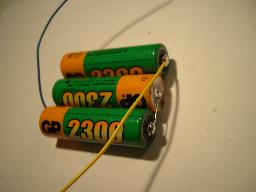 The replacement batteries are shown on the left - when you join these batteries be careful not to short them! 2300 mA/h is quite a lot of energy and you will at least need a new battery after such an accident. Be sure to tape the ends of the wires to avoid accidentally touching anything you would not like to touch (other batteries, your calculator's internals, etc.). |