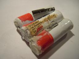 Most vintage battery packs have deteriorated during the last up to 30 years. The pack shown on the left is an actual example from a TI-59 I acquired at an online auction. I already removed it from its custom plastic enclosure. (Be careful at operations like these since the residue on the batteries is toxic and corrosive!) Please note that (as always) I will not take any responsibility for any damage or injury which might result from attempts to perform any repairs and/or changes on your calculator, battery pack, etc.! |