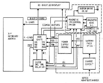 The picture on the left is copied from the "TI58/59 Service Manual", page 2 and gives an impression of the overall architecture of the calculator. The heart of the machine is a 4 bit TMC0501 processor surrounded by four RAM ICs of 1920 bits each, two ROM and support logic chips, an interface chip for the card reader/writer, the necessary clock circuitry and a switching power supply generating three MOS compatible voltages. |