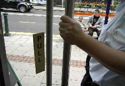 ...and the door can be opened by pushing as Thomas does on this picture - despite the fact that there is a sign reading "PULL" mounted on the door. |