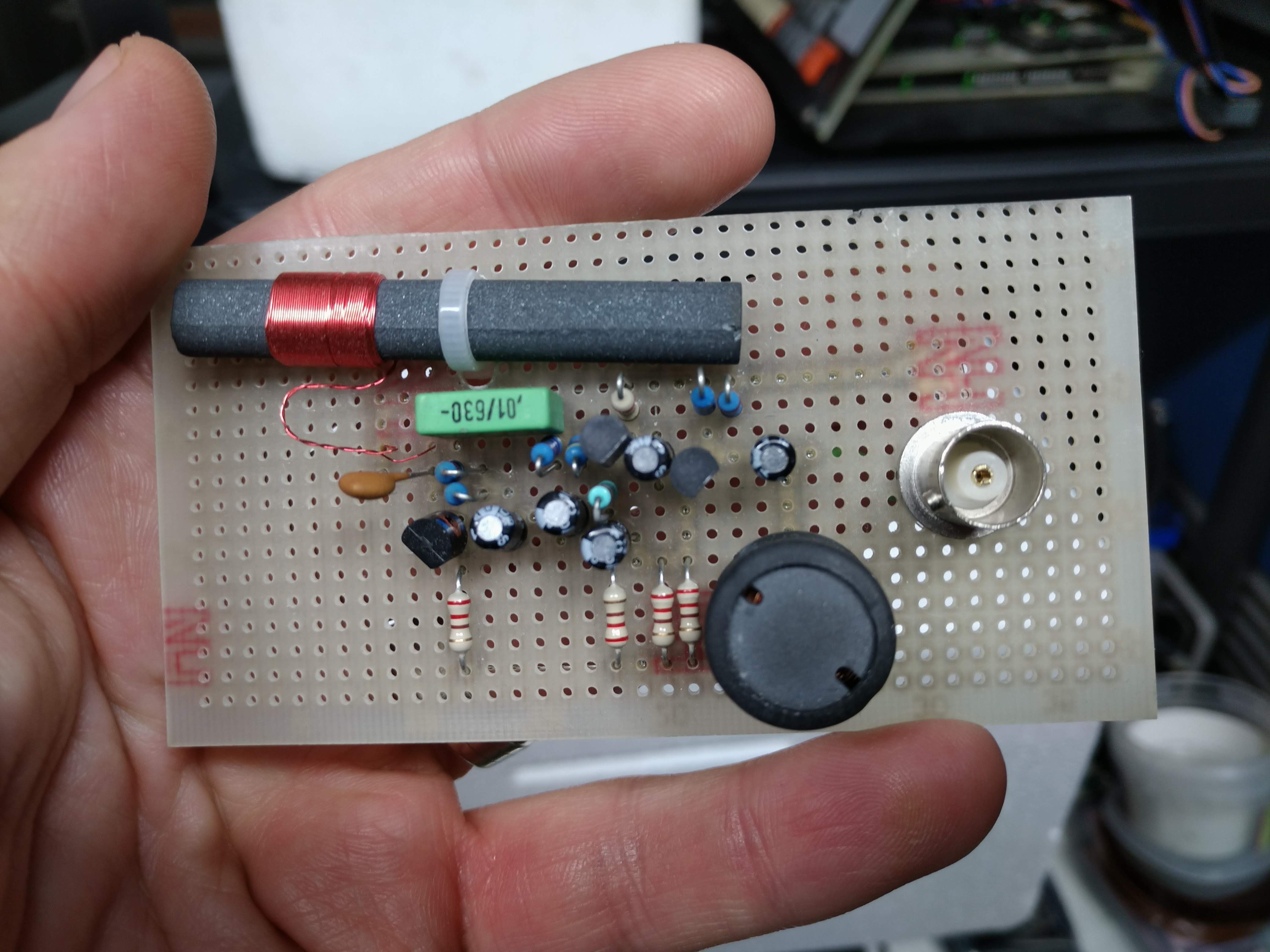 First of all I had to build a simple ferrite antenna - I found an old ferrite rod (I have not the slightest clue where I salvaged this item) and wound about 150 turns of thin wire onto it. Then I built a resonant circuit by paralling this simple antenna with two capacitors. With a square wave generator, an oscillosopce and a frequency counter I tuned this circuit to be resonant at quite exactly 77.5 kHz. This tuned circuit can be seen in the picture of the antenna on the left half of the small circuit board. The capacitors I used turned out to be two capacitors of 2.2nF each in series. |