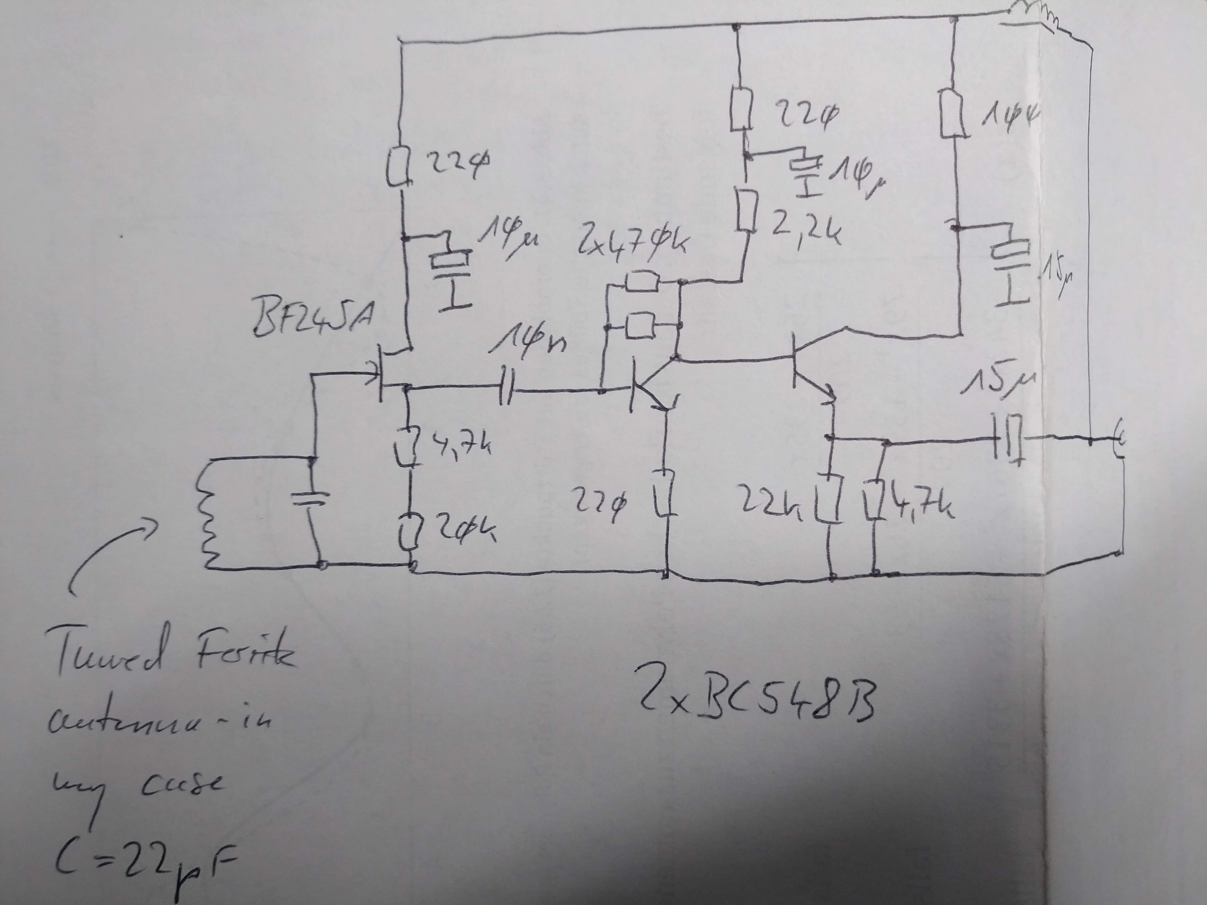 On November 24th, 2009, I got a mail from Noud with the following improvement on the (way too simple) circuit above: (1) Regarding your BF245B stage - put a good Ld in series at Vdd in front of Rd (< Rd//Rs). ( @ 77.5kHz::: <8kOhm, so say 4kOhm: Ld = 8.2 [mH]) - put some matching (resonant at 77.5kHz) Cs parallel also from the Rs towards Vss. Cs = 513 [pF] (2) Then "the trick" - Route from Vdd to Ld a single turn (or two...) around the ferrite rod in a second coil (co-coupled) with the input coil. This provides positive feedback, that can neutralize ferrite losses completely. (But beware of oscillations!, suppress with less turns, or R, or C). Result: serious signal gain! |