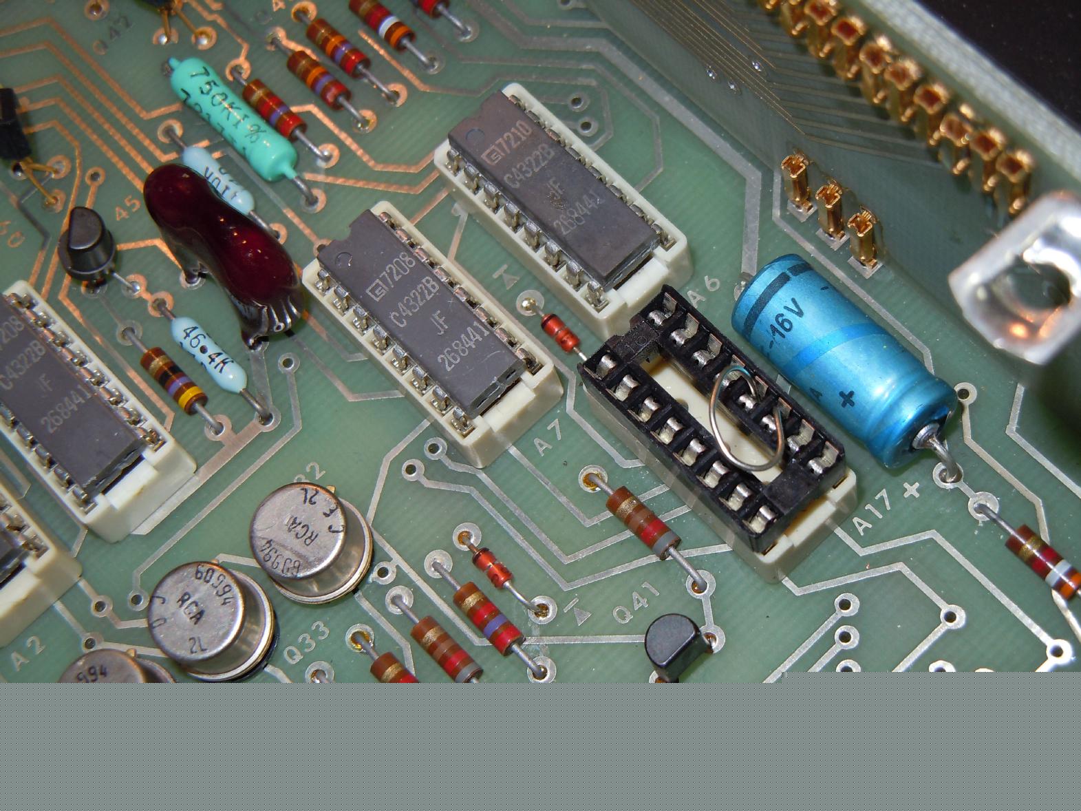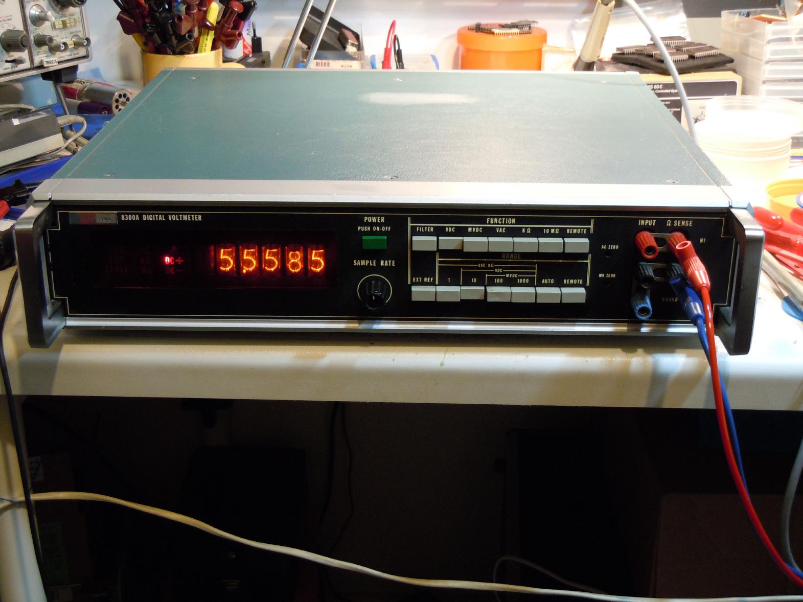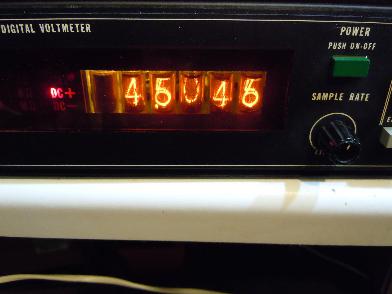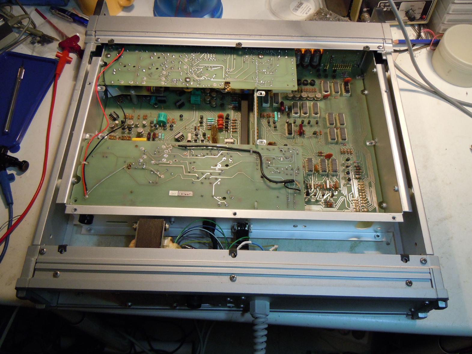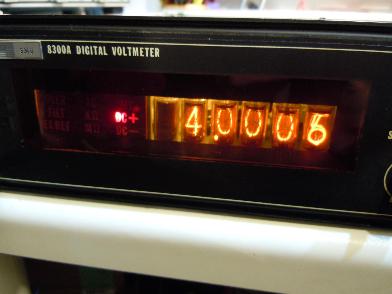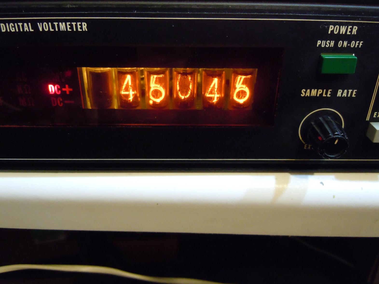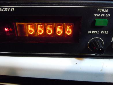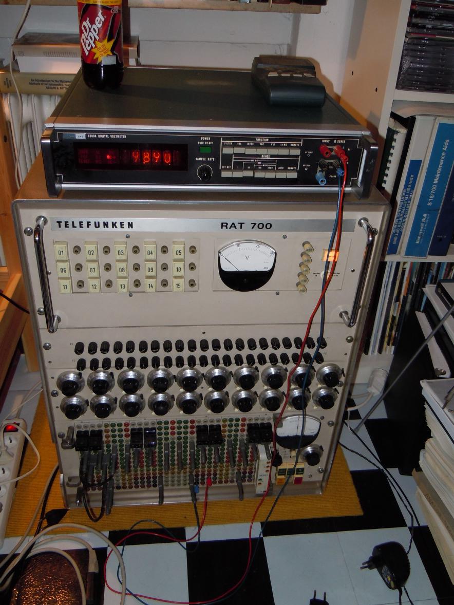 Some initial tests with a simple calibrator showed that the instrument was still within its specifications (after 38 years!) and I placed it on top of one of my Telefunken RAT 700 table top analog computers where I will use it as precision read out instrument. The picture on the left shows the voltmeter in its new setup. Unfortunately this pictures shows something else: The least significant digit is not working! *ARGL* I thought that I had found and corrected all faults, but this right most digit quit working only after a couple of minutes of using the instrument. Back to the workbench again (it is no fun to open the instrument - the top and bottom cover are held in place by six screws each. Below these two additional covers are found which are held by five additional screws each. In addition to that the buffer board must be removed (two screws) which is a bit tricky since it has a lot of pins and some fixed cables attached to it...) - after measuring signal forms in the Nixie driving circuitry it turned out that the first stage driver of the right most digit had died. Replacing it with a BFY 43 transistor cured the problem - all digits are now working again and I really do hope that the instrument will now work without further assistance for next 40 years. :-) |
