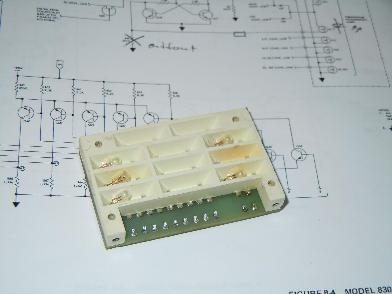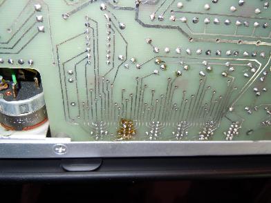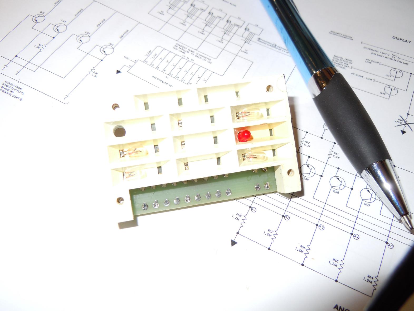 The instrument itself seemed to be working quite well, but what did not work were most of the indicator incandescent lamps. These are mounted in a quite delicate plastic block attached to a printed circuit board with very (very!) tiny holes for the leads of the incredibly small (and defective) lamps. Since I neither had such lamps at hand nor did I want to use these, I decided to replace the faulty lamps with red 3mm LEDs. The picture below left shows my (quite horrible) modification to the status indicator enclosure - I drilled through the plastic and the circuit board to make enough room for a 3mm LED to fit in. The next step involved removing some 470 Ohm resistors which were previously used to make sure that even lamps that were not brightly lit were heated by a base current. This current was high enough for the LEDs to be lit even when they were supposed to be switched off. The picture below right shows the resulting display - the "DC +" is clearly readable although the LED produces a much smaller spot of light than the previously installed lamp. |