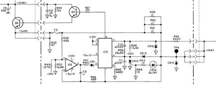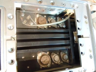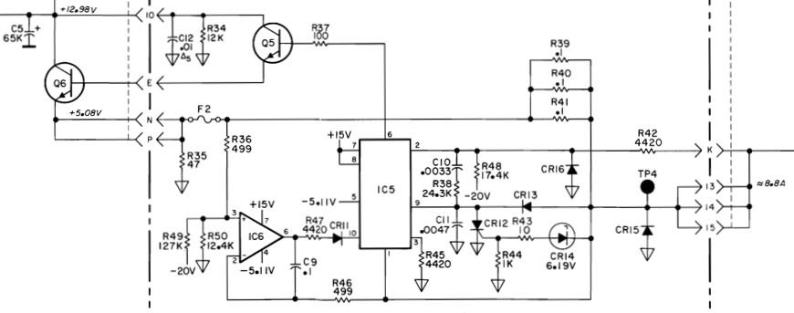 The section delivering the +5 V supply for the digital circuits of the HP3330B is shown on the right. It turned out that Q6 (a 2N3055) was defective. Replacing it yielded... Not quite +5 V - in fact the output was about +4.2 which was enough to display some garbage but not enough for any real operation. So something else had to be defective, too. (The picture below left shows the 2N3055 which is accessible behind the right side of the instrument.) |