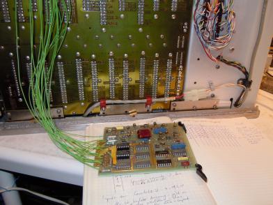 The first and simplest problem was (and still is) that I do not have an extender board. Without this tool it would have been just horrible to debug A26 in its natural habitat, so I decided to make my own hand wired extender using 20 pieces of wire. The result shown on the left is not pretty but it worked great and helped a lot. (Please note the hand written table in my note book below the A26 board - I wrote down a lot of bit patterns during the debugging phase - all in all I filled 18 pages in my notebook with this project!) |