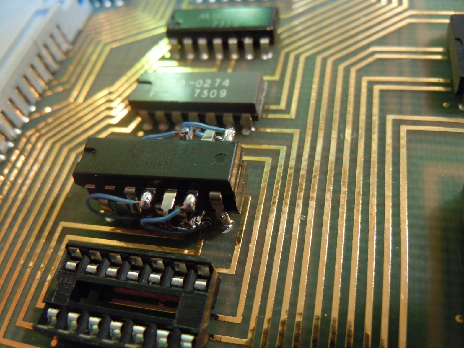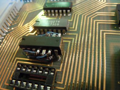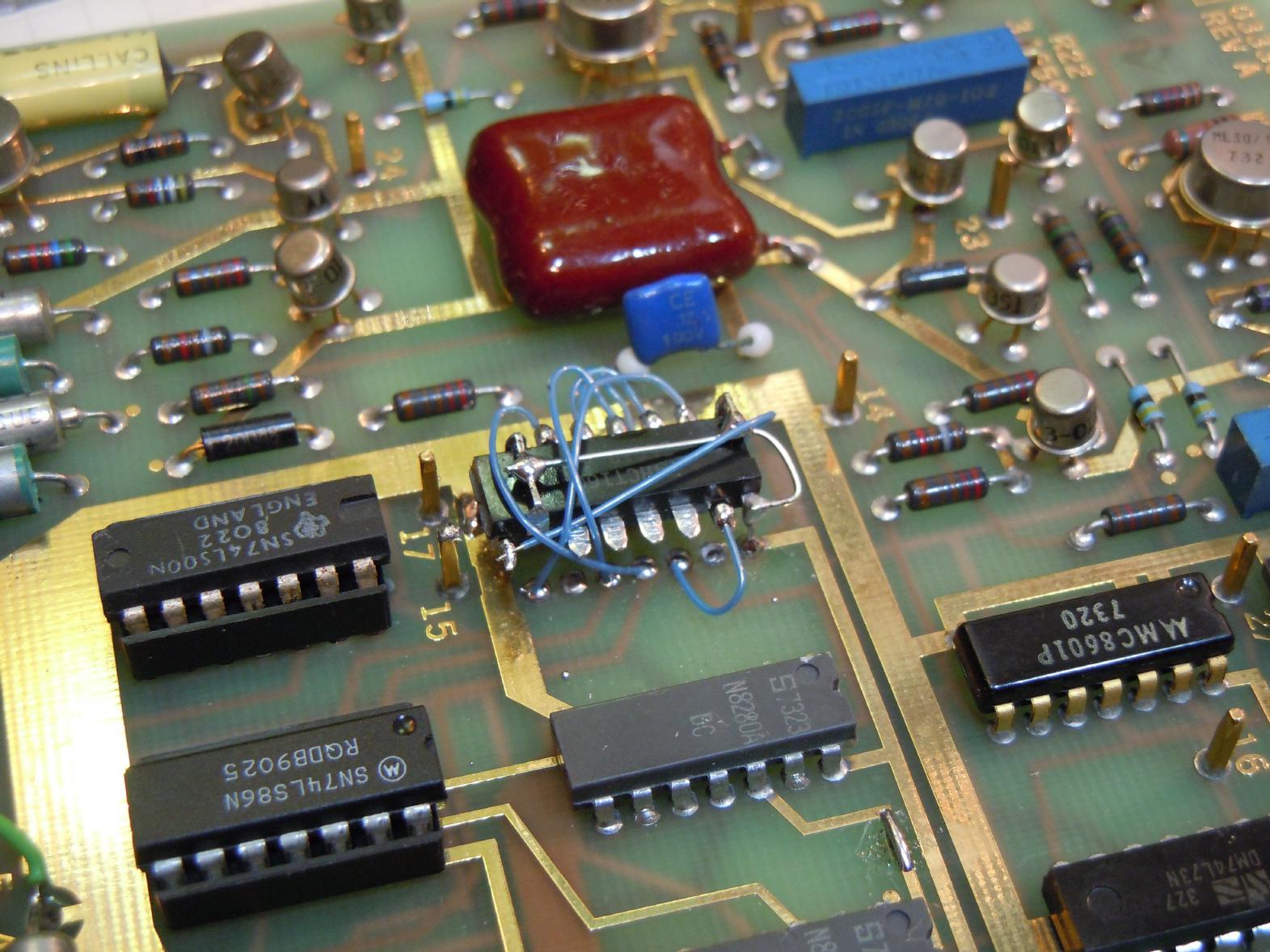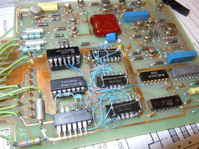 To make a rather long story short: I had to generate a single artificial clock pulse during the strobe time of the divider chips on A26. For this purpose I differentiated the /LD signal with a resistor-capacitor combination, generating an active low signal of short duration that gets low during /LD being low. Combining this signal with the original clock signal with a 74LS08 AND gate yields the desired effect, a single additional clock cycle just for loading the 74HCT160 chips with the necessary bit pattern. Unfortunately it turned out that all three 8280 chips were defective. (Quite strange: The one in the middle had a crack through its case and came apart during removing the IC.) This was where I made my next error: I just replaced the 8280 dividers by 74HCT160 - it took a moment for me to realize that this was plain wrong since cascading 74HCT160 works completely different than cascading 8280 chips: While the 8280 were chained using their 9-output, the 74HCT160 are chained using their TE inputs and carry outputs. Changing my erroneous circuitry was simple. |