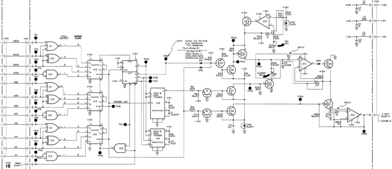 The digital input section of A26 is quite tricky - every four bit BCD input is preprocessed with a triple input NOR gate, a XOR gate and an inverter. (Why? Because it needs complemented numbers since it controls an attenuator and not an amplifier - the three gate solution is quite tricky and elegant.) Comparing the inputs and outputs to these three gate sections showed that the inverter (in fact a quad NAND gate) and the quad XOR were both defective. The picture on the right shows the replacement parts mounted in IC sockets (I used a 74LS00 and a 74LS86). Unfortunately this was not the only problem. I decided to have a deeper look at the three decimal divider stages based on 8280 DTL decimal divider chips. Starting with the least significant digit I checked the behaviour of the divider with a logic analyzer. It turned out that the first of these dividers did not work at all which was where my following problems started. |