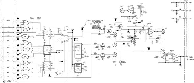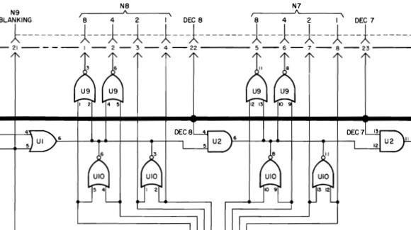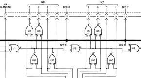 Now it was time to have a close look at the instrument - entering a frequency like 1 MHz displayed complete garbage in the two digits second and third to the left of the frequency display. *sigh* Another bug. Both digits displayed strange values - entering different numbers and shifting them through the display showed that both digits were differently erroneuous. I hoped that it was only a display problem and not a problem rooted deeply in the microcoded control logic, so I concentrated on the display section of the control unit. The schematic on the left shows the section driving these digits. |