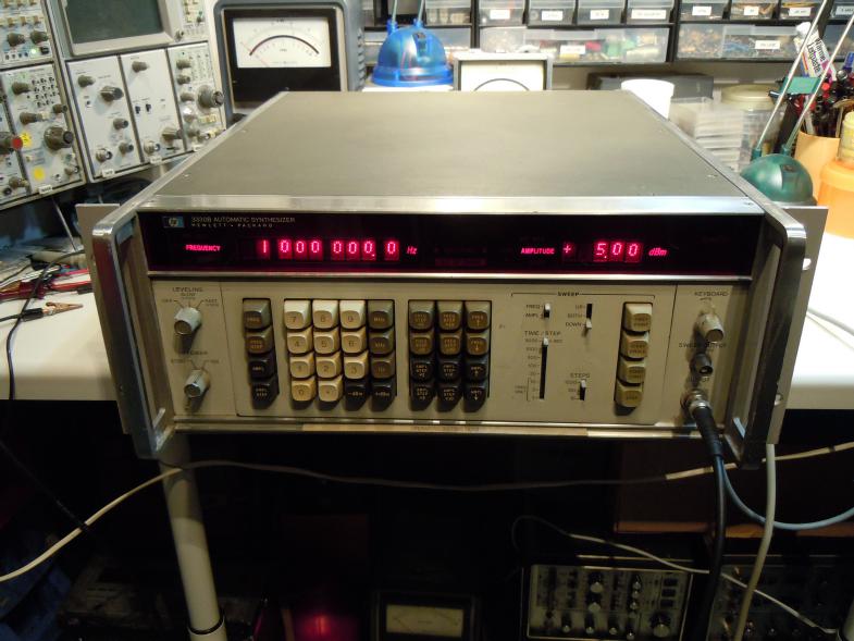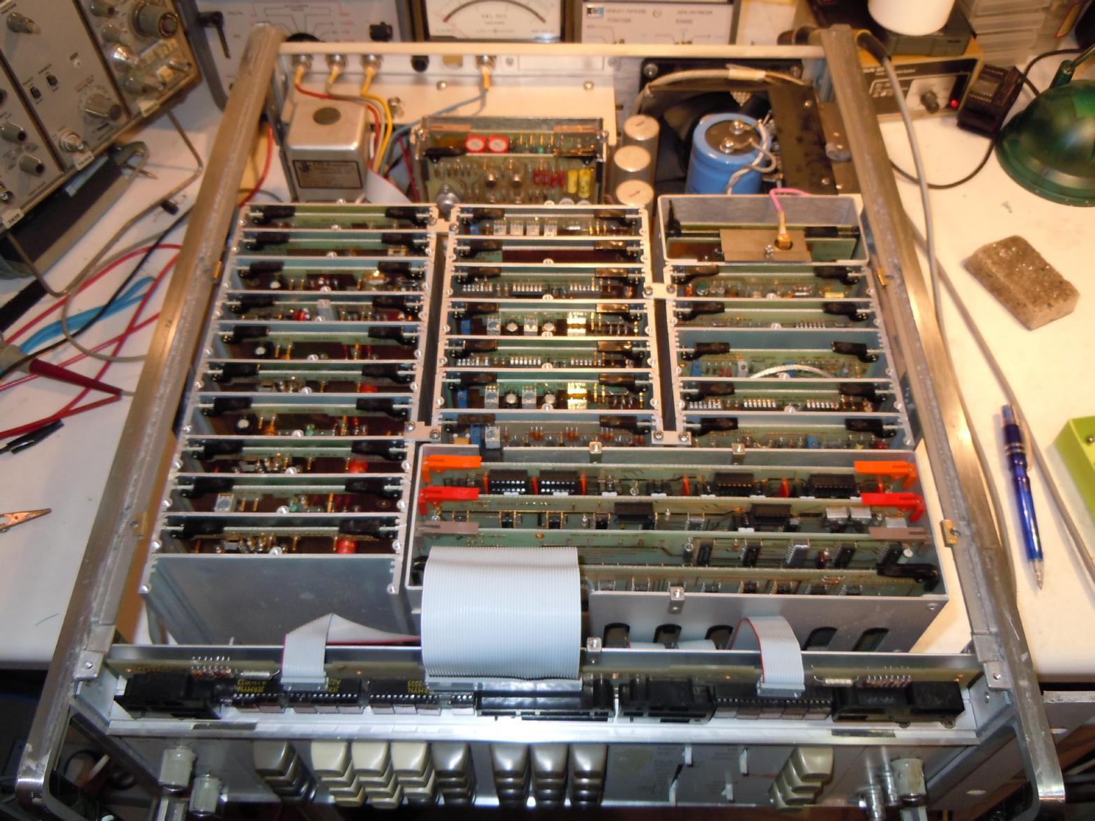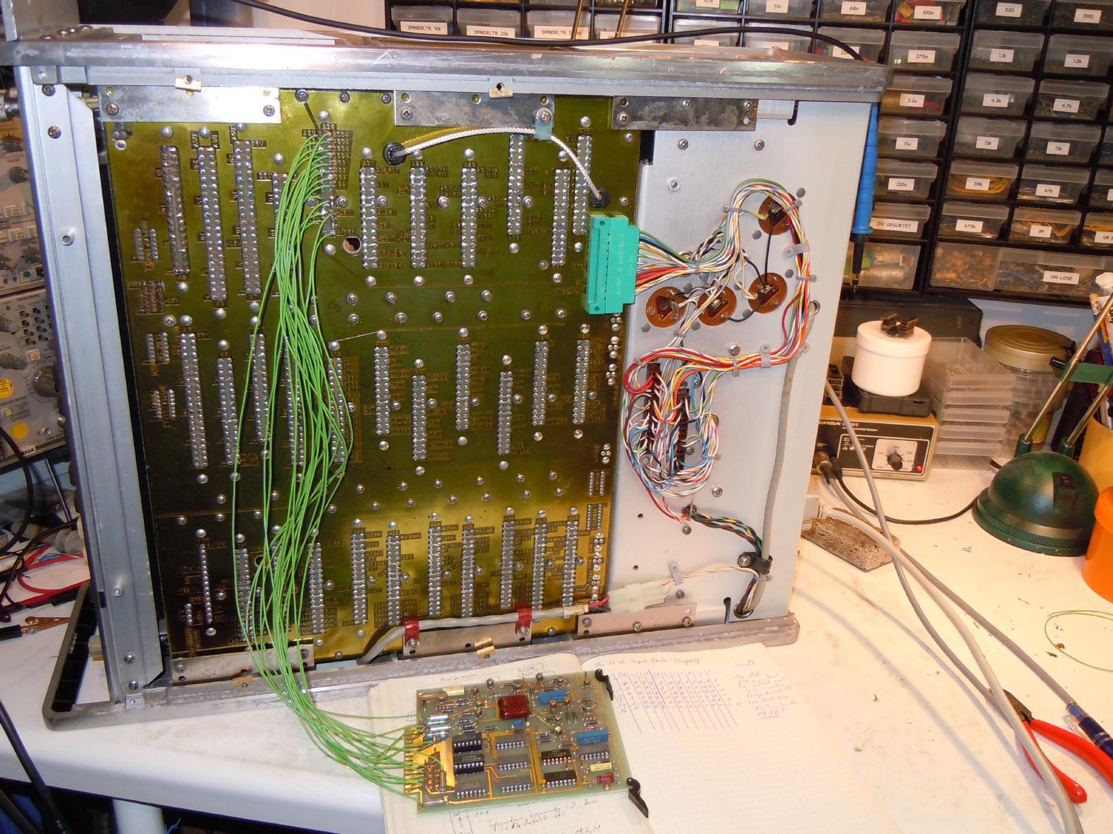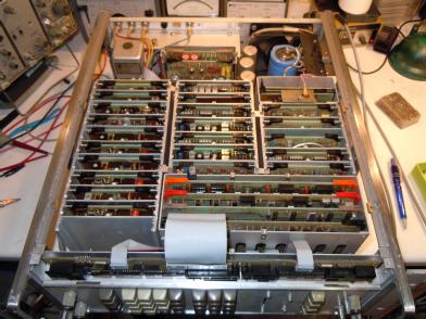 After fixing this wiring error I was pretty sure that the instrument would now work. How wrong I was... Sometimes amplitude settings were OK, sometimes they were wrong by a rather large amount... Careful probing showed that a connection on A26 was bad - the output of one of the three input NOR gates was not "really" connected to the appropriate input of the corresponding divider chip. This is really strange since the board looks quite beautiful and there is no sign of any physical damage at all. Resoldering the two connections did not cure the problem - the connection within the multilayer board was just not stable. I then added an additional wire wrap wire and the problem was cured. Unfortunately this wasn't the last bug: The least significant amplitude digit turned out to be in error for the digits 8 and 9. 8 and 9? Should the MSB be missing? Yes! Another defective connection - this time on the multilayer backplane. I fixed this with yet another wire wrap wire. The picture on the left shows the repaired and still opened synthesizer - isn't it a beauty? |