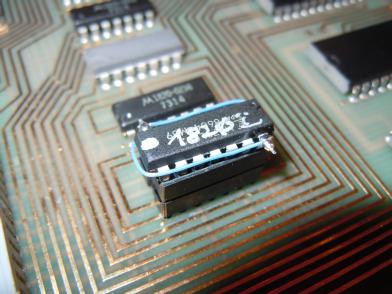 After a lot of thinking I came to the conclusing that U10 might be defective, too. Replaing it (this time it really :-) is a quad NOR as the parts list shows) was not so simple since the wired OR capability is used, so I needed a quad NOR with open collector output. *sigh* The best solution I could think of was to stack a 74LS32 quad OR and a 74LS06 open collector inverter and create my own open collector quad NOR - the result is shown on the left side. Unfortunately there is not enough clearing between the display controller board A5 and its enclosure for an IC socket and two ICs stacked on each other, so I had to directly solder in this contraption. Believe it or not - the display worked immediately after this change. I could enter any frequencies and they were displayed correctly! |