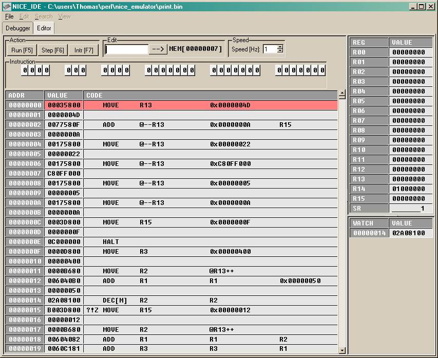 While developing NICE and its predecessor, u-EP-1 (which resulted even in a partially working hardware implementation), two more or less rudimentary emulators were written to allow studying the processor architecture, its features and drawbacks. These emulators were written in VAX-Fortran and VAX-C respectively, but both lacked a suitable user interface - the Fortran written emulator featured a batch interface reading command files and writing result files, the C program had a command line interface. During 2004 a friend of mine, Thomas Kratz, wrote a wonderful NICE emulator using Perl and Tk for the GUI (which in fact led to a very short lightning talk at the YAPC-2004 in Belfast). |