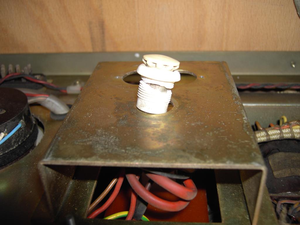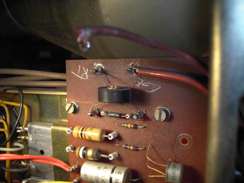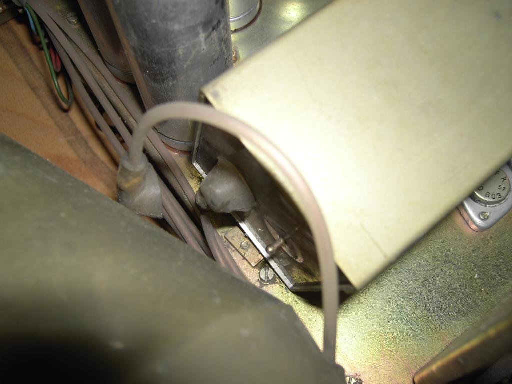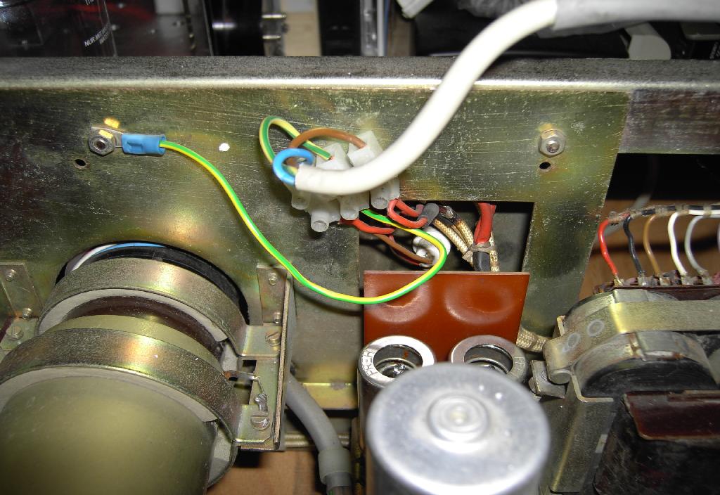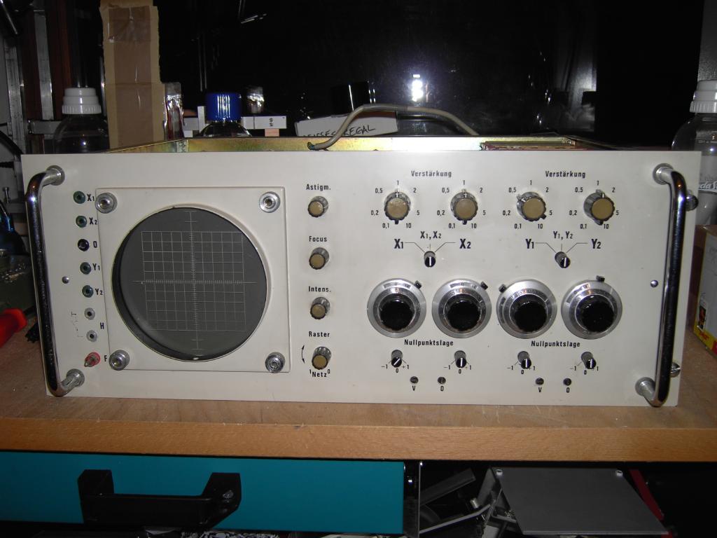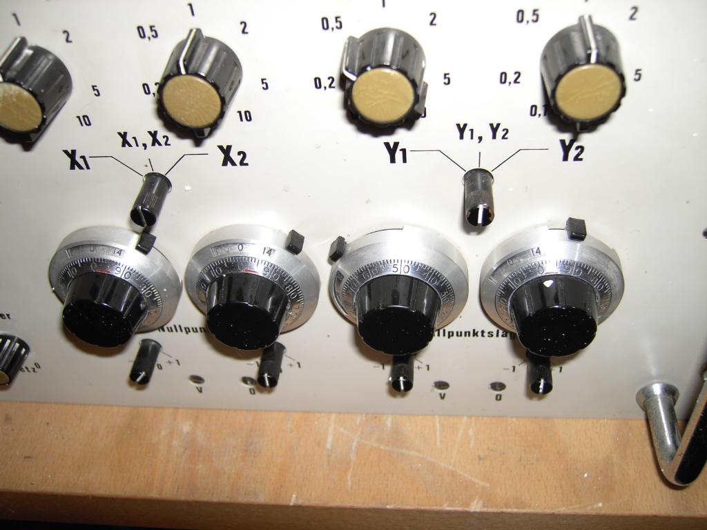 The picture above shows a TELEFUNKEN OMS 811 dual beam oscilloscope which was normally used in conjunction with TELEFUNKEN's wonderful transistorized precision analog computers like the large scale RA 800(H) but also with the table top analog computers RA 741 or the more modern RA 742. I bought the oscilloscope shown above about two weeks ago for approximately 60 EUR, an absolute bargain! A first inspection made it clear that the oscilloscope had been modified and was at least not in "mint condition" (to be honest, I did not expect anything else thinking of the low price of this wonderful device): Two of the precision knobs for the beam position control potentiometers had loosened - fixing this was simple after finding a suitable tool fitting into the tiny screws of the knobs. That was simple. :-) Now, what is that cinch plug doing in the lower left corner of the oscilloscope? Normally there should be a special connector looking like a 4 mm banana jack which is compatible with the flash light cables from (ancient) photo cameras. Normally this input was used to start a computation at the very moment of taking a photography from the oscilloscope screen. Since I do not need this feature I decided to remove the (horrible) cinch plug and replace it with a simple 4 mm banana jack. Shorting this input to ground would now trigger a computer run. Another problem was the broken fuse holder shown below. Although a fairly simple device it was hard to replace since its mounting bracket can not be removed from the oscilloscope's frame, so there is not much room to work in. The next thing I noticed was that the old line in connector of the oscilloscope was missing and had been replaced by a fixed line cord without a pull relief which was connected to the device by a simple luster terminal. In addition to this the leads of the cables had been tinned which is not a good idea since tin under pressure (of the screws of the luster terminal) acts like a fluid which will eventually result in a bad connection: Clearly this had to be changed - unfortunately I had no spare power jack from the 1960s, so I decided to stay with the fixed power cord which I soldered to the transformer inputs. In addition to this I built a simple pull relief which fits into the space formerly occupied by the power connector (please note the alumunium plate covering the hole). The picture below also shows the new (old :-) ) fuse holder replacing the broken one. The next thing to fix was the acceleration high voltage connector shown below - it had become loose because the high voltage transformer was only secured with one screw instead of two which caused the whole transformer and rectifier module to break free during the postal transport. The problem was that the connector had been under severe stress and was deformed giving no reliable contact. I had to disassemble the connector and tighten it before reconnecting it to the high voltage output terminal. The picture below shows the high voltage transformer and rectifier module. Fortunately it did not damage any other parts of the oscilloscope, so the only thing I had to do was flattening one of its mounting brackets and finding a suitable screw for the second bracket. After fixing these (minor) problems it was time to switch the oscilloscope on for the first time after its restoration (never attempt something like this without a isolating transformer and always keep in mind that oscilloscopes employing electron tubes have lethal voltages present at many places!). After the tubes had come to life (there are, in fact, three tubes in this device - the display tube, a DN 13-14, and two double triodes used to control the deflection voltage of +/-600 V!) it became clear that the oscilloscope was far from being working properly. The beam was incredibly bright and the intensity switch did not have much effect on this, so I immediately switched the oscilloscope off to avoid damage to the display tube (in fact there were already some blind spots when I got the instrument, so I assume that its prior owner had tried to operate the instrument with this erroneous beam intensity for a prolonged amount of time) and started thinking - what would cause such a behaviour? The beam was so bright that not only the two expected dots (X1/Y1 and X2/Y2) were visible but also the movement of the electron beam between the switch over from one input pair to the other! The following picture shows the oscilloscope on my work bench setup for debugging: The first thing one will normally do is to check all power supply voltages - in this case I wired all outputs I wanted to check to a rotary switch allowing me to scan the output lines quickly to avoid a burn in of the electron beam. It turned out that all voltages (+/-15 V, +55 V - this is used for the blanking circuitry, +/- 600 V - used for the deflection circuitry) were well within their specifications, so at least there was no problem with the power supply itself. So I started to have a look at the blanking circuitry which is a bit tricky in the OMS 811. There are two circuits working in an antagonistic way: