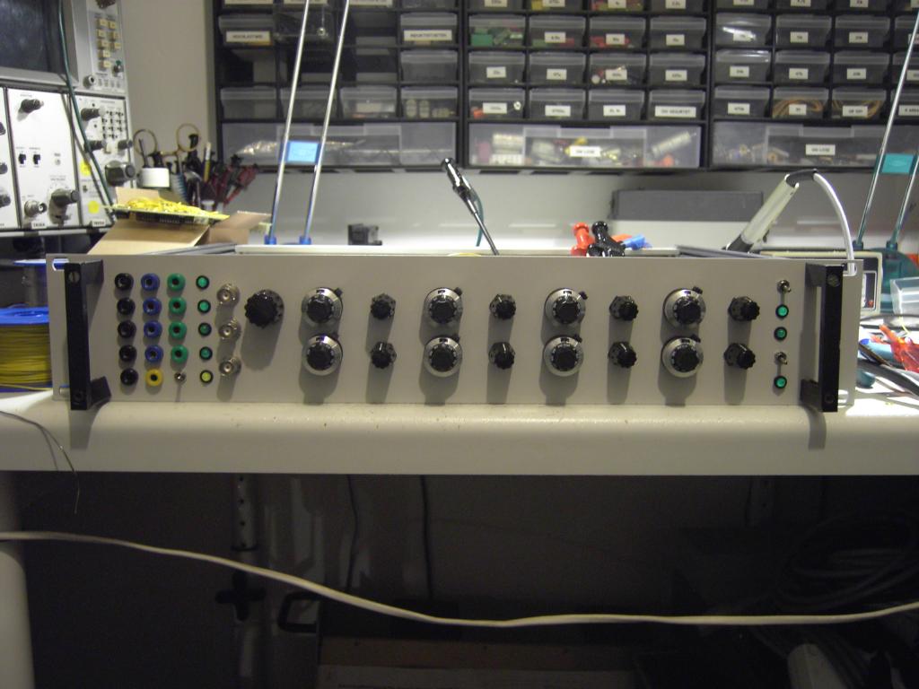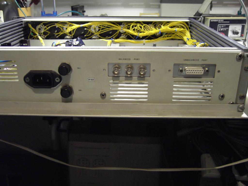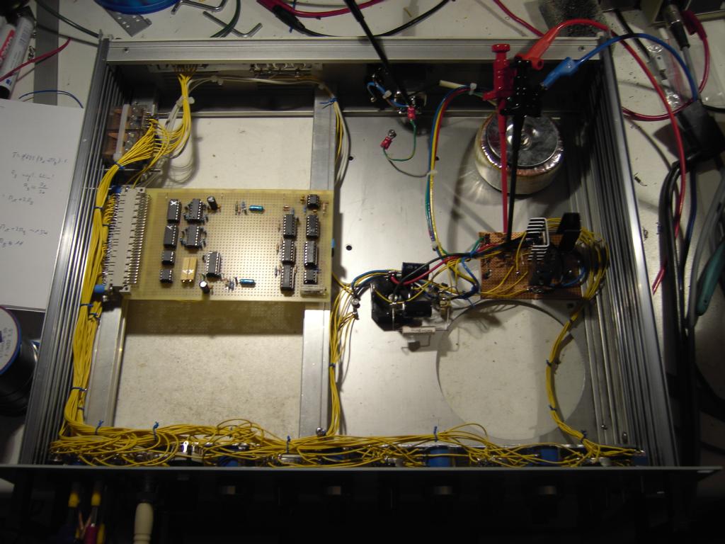 The picture on the right shows the overall multiplexer - the right half of the drawer is occupied by the (small) power supply, the left half houses the multiplexer electronics itself and the input selector relays. (The picture was taking during the test phase, thus the additional cables.) |
