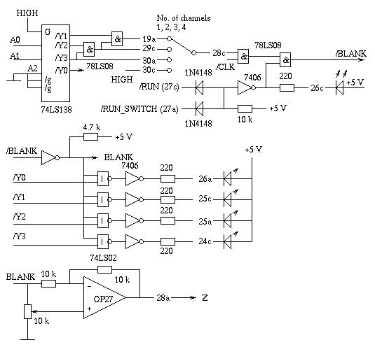 ![]() The blanking logic shown in the schematic above generates an appropriate blanking signal to dim the oscilloscope's beam during beam movements between figures. Furthermore this Z signal can be used to suppress one to three of the maximum of four figures displayed simultaneously without having to readjust the beam intensity The operational amplifier (OP27) is used to drive the Z signal for the oscilloscope - with the aid of the potentiometer the polarity and pulse height can be adjusted to match most common oscilloscope's Z axis inputs. (For example: My HP 180C oscilloscope expects a +2 V pulse to dim the beam while ground potential at the Z input will display the beam in normal intensity.) |
