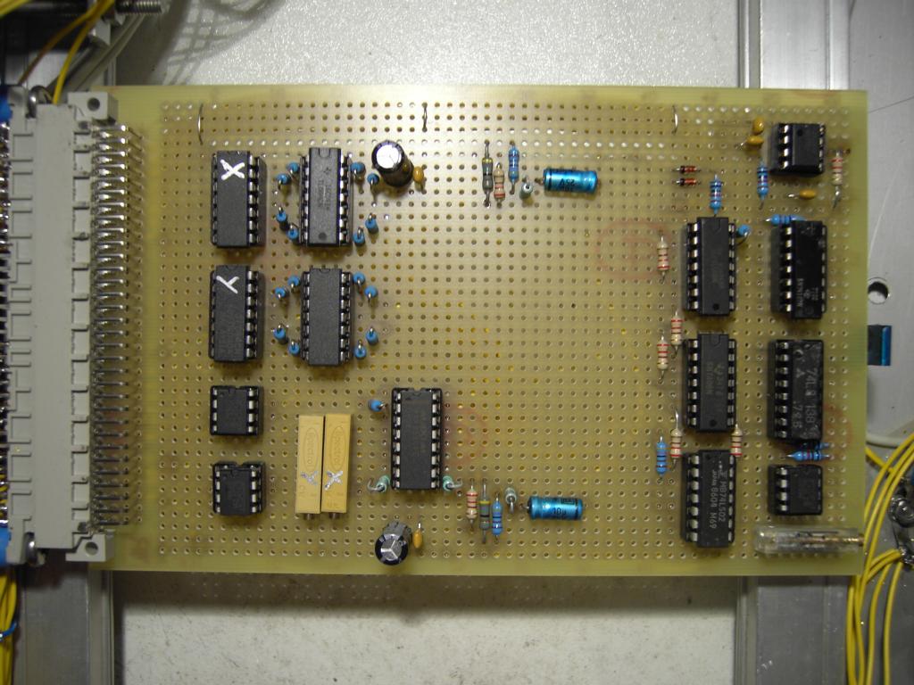 The two pictures above show the central circuit board (component side view on the left, soldering side view on the right). Next to the VG connector are the operational amplifiers, the calibration potentiometers and the multiplexer IC itself. The other half of the board is populated with the blanking logic and associated driver circuitry. Some passive components are used to yield proper input voltages for the position setting potentiometers. | |
