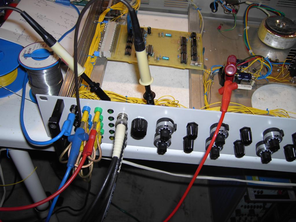 Shown on the right is a photo taking during the calibration phase. Since the MAX 355 multiplexer has a non zero resistance, the attenuation effect caused by this has to be corrected by the output operational amplifiers (OP27). To calibrate the multiplexer, I used a 1 kHz, 2 Vpp input signal for X and Y, set all attenuator potentiometers to 0.1 and adjusted the two calibration potentiometers mounted on the central circuit board for an output signal of 2 Vpp. (The attenuation by 0.1 will be compensated by the intrinsic amplification by a factor of 10.) |