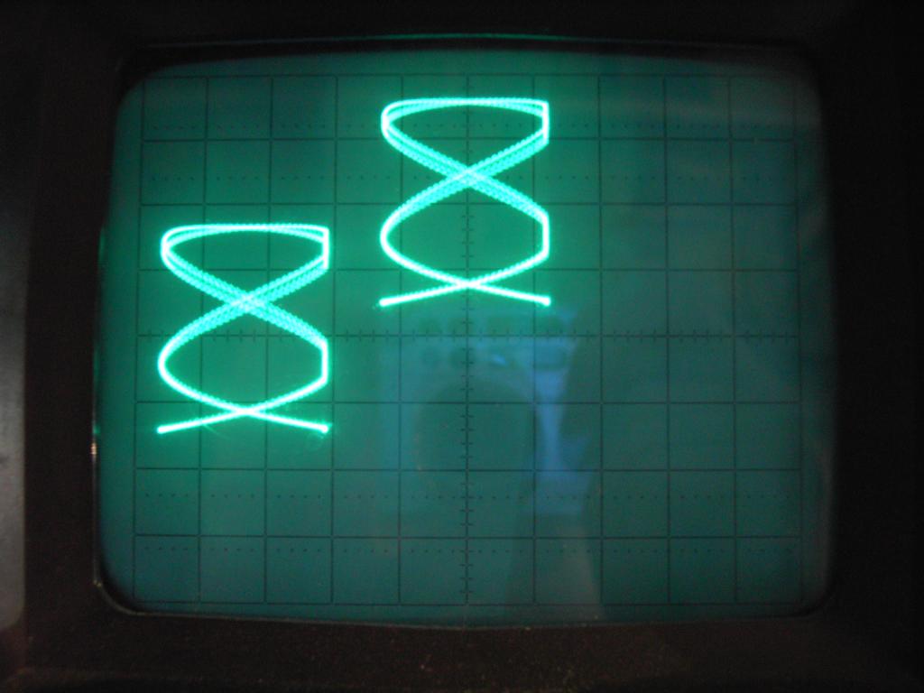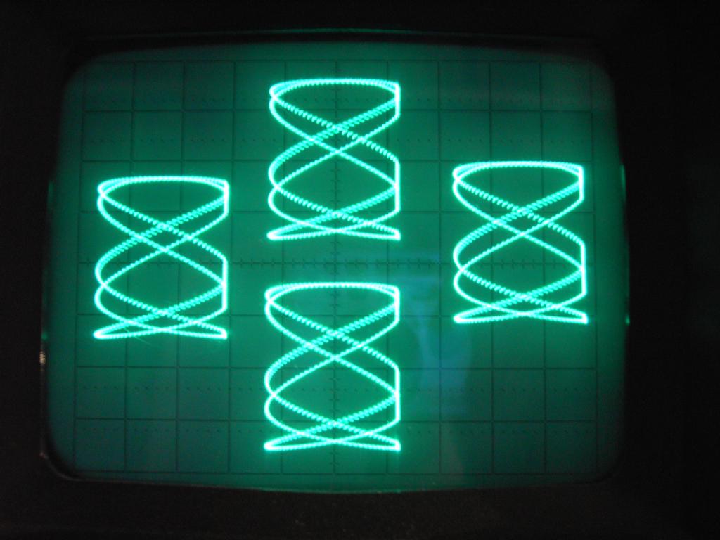 Although I have some Tektronix oscilloscopes with appropriate plug in units yielding an four channel display, I always wanted something else: A true four channel oscilloscope with four distinct X/Y inputs which would allow me not only to display four traces with a common X deflection but to draw up to four distinct figures on the screen at the same time. Something like this is very useful in conjunction with an analog computer, i.e. one can display different movong masses in a simulation at once, etc. This led to the development of such multichannel X/Y oscilloscopes like the truly wonderful Telefunken OMS 800 dual channel oscilloscope. Although I am the proud owner of such an instrument, its limitation to only two channels was a bit disappointing (currently I want to simulate a multiple spring-mass-system and display all moving masses at once to get a feeling for the forces of the system), so decided to build my own multiplexer. The front plate of the instrument can be seen above - below is a picture taken during the calibration of the multiplexer (it is a bit blurry - sorry for the bad quality - I desperately need a camera fixture for my oscilloscopes) - four Lissajous figures displayed at once (it is always the same figure since, it is some kind of a proof of concept picture):