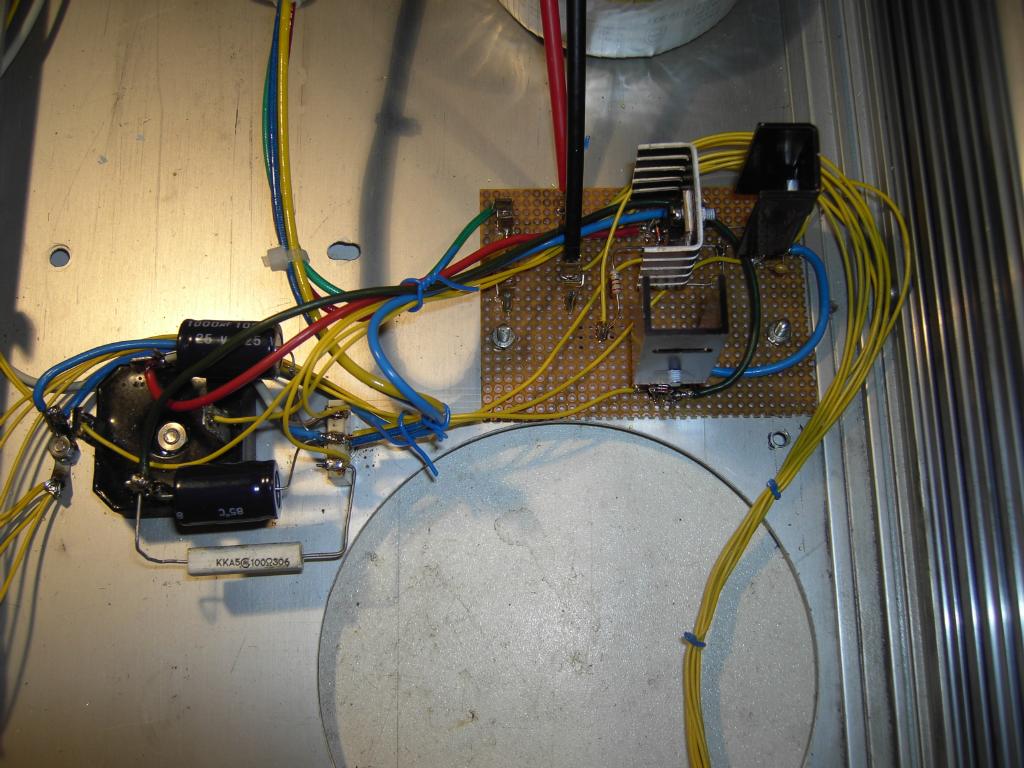 The power supply, shown on the right, is quite simple. I used a toroidal core transformer yielding 2 x 18 V with 800 mA each, followed by three integrated voltage regulators (7815, 7915 and 7805 for the blanking logic). The rectifier is way too large but was the only one I found when I started building the device. |