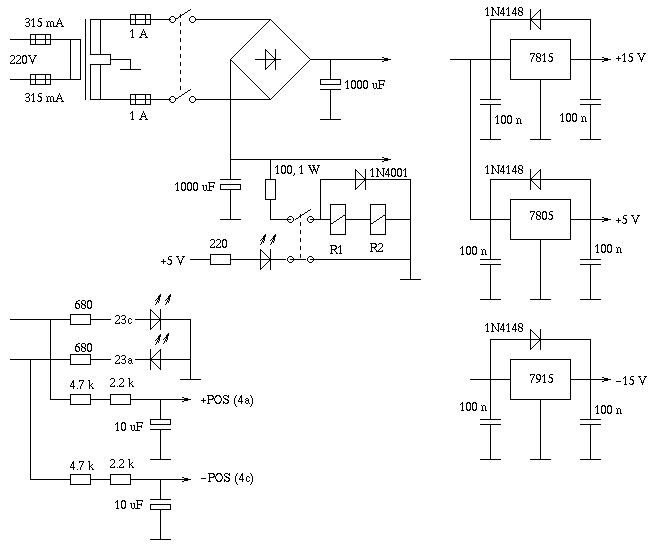 ![]() The picture above shows the power supply schematic - it bears nothing special at all, the two signal +POS and -POS are the feeder voltages for the position control potentiometers on the front plate, the two relays are the input selector relays mentioned above.