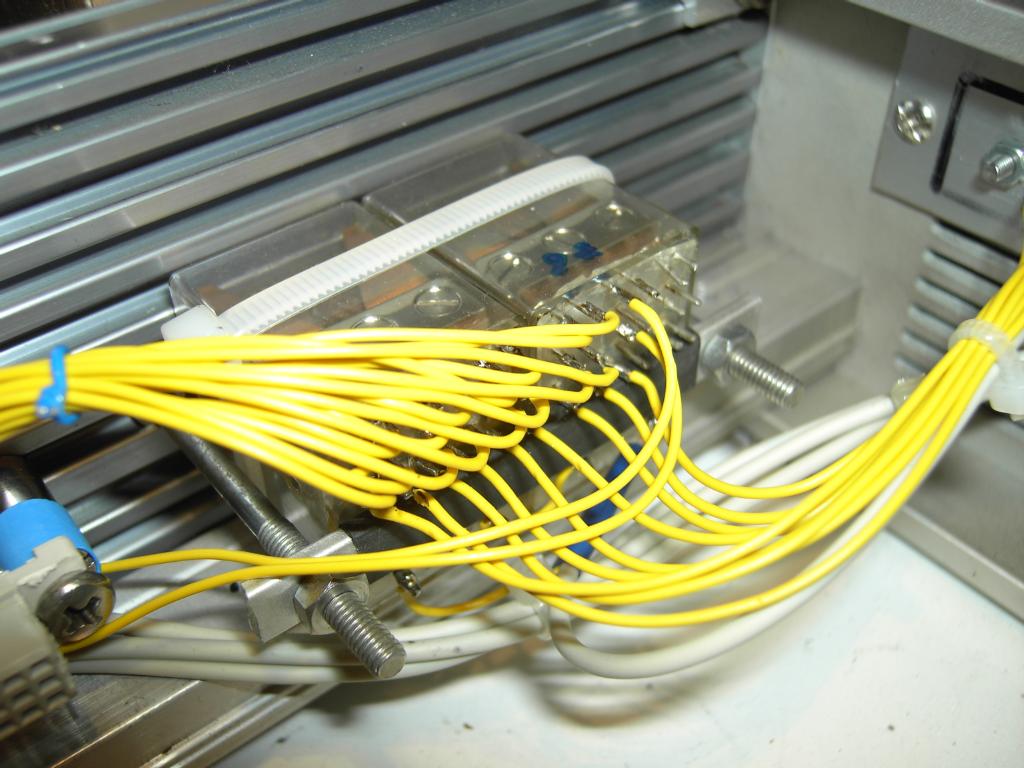 Shown on the left are the two input selector relays - fortunately I found two relays with six contact pairs each - eight contact pairs are needed to switch between the eight front panel X/Y input jacks and the back panel connector while another contact pair is needed to switch the blanking input between these two sources, so nine out of twelve contact pairs are utilized. |