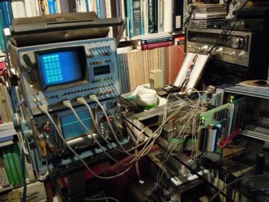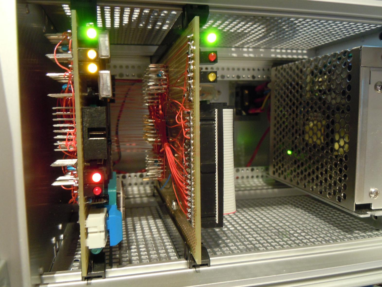 The picture on the left shows both cards, the CPU board on the far left and the IDE controller right next to it, in operation. By the way - at first I thought about building a simple power supply with a linear regulator - then I wondered if I should use an old PC power supply and then I realized that new switching power supplies, capable of delivering 5V with 8A, cost only about 18 EUR... That is the reason for the small and modern power supply on the right hand side of the enclosure. |