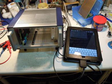Since the tiny Z80 computer consists of two boards by now, an enclosure was needed. I decided to use a 10 inch standard enclosure (had I known before how much fiddling would be required to build the enclosure out of the many parts delivered by my supplier, I might have settled for something else :-) ). The picture on the right shows the first picture of the CPU card in its new housing. The iPad is used as terminal (a very useful feature :-) ). |