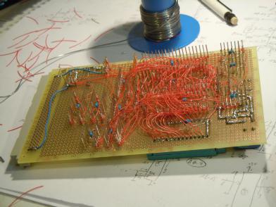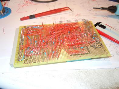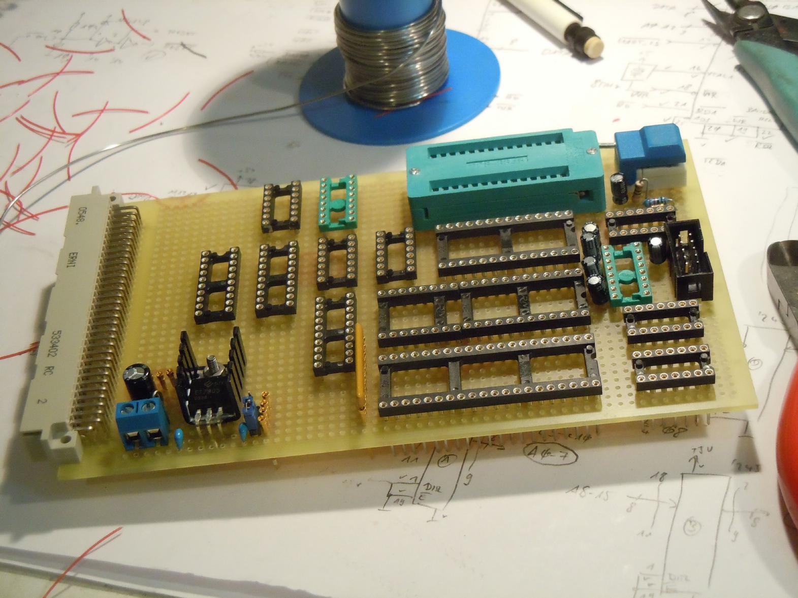 ![]() In September 2011 I somehow got the feeling that I just HAD to build a small Z80 based computer again. My last homebrew Z80 was built when I was still in school (more than 20 years ago) and somehow I felt a bit nostalgic and missed the (truly) good old times when computers were small, rather simple, easy to understand and program. Times when writing software meant writing assembler code and not installing several GB of a development package which creates files no smaller than several MB. So I searched for useable parts in my hardware repository and found everything necessary to build a small (tiny, in fact) Z80 based computer. Since I love wire wrapping, I decided to build the computer on a single Euro card using wire wrap sockets where ever possible (if you happen to have wire wrap sockets or wire etc. and would like to give it to a good home I would love to take care of it - I am running low on wire wrap parts and it is next to impossible to find new sockets etc.). Designing and building the card took two evenings of about 5 hours each, and debugging took another, third evening (there were only four wiring errors but I made a software error in configuring the UART which was a bit hard to find). The left row of the board shown above contains the TTL clock oscillators for the Z80 CPU (4 MHz) and the 16C550 UART (1.8432 MHz), a MAX232 for the serial line, a 74LS14 for the (simple) reset circuit and the reset push button. The next row contains the Z80 CPU, the 16C550 UART, a 62256 32kB RAM and a 27(C)512 32kB EPROM in a ZIF socket. The remainder of the board contains a simple voltage regulator with a 7805, several bus drivers (74LS245) and some address select logic. The following pictures give an impression of the process of building this simple computer: |