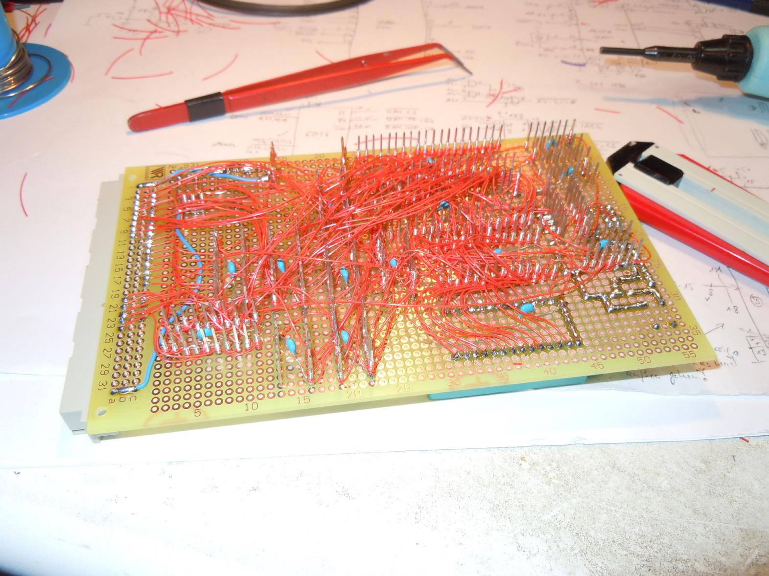 While the processor card worked quite right out of the box, the IDE controller was bit of a challenge since there were two independent bugs buried in its logic. The first problem was that the 74LS32 quad OR gate chip was defective (this is all the more puzzling since it was a new device). But more difficult to find was a mistake I did concerning the two select lines of the IDE device. I "thought" that I had understood the IDE logic and wired one of the /CS-lines to ground as I would have done with any TTL chip requiring two chip select lines. I did not realize that the two /CS lines act in fact as yet another address line and allow access to the upper registers of the IDE device. Fixing this bug was extremely simple, but finding it was hard since I was so sure that grounding the second /CS line was the right thing to do. :-) |
