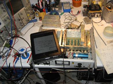 As the sticker reading "Defective!" already announced, the device turned out to be inoperable when I tried it for the first time with all of its boards in place (prior to this, I powered it on with only the regulator board in place to make sure that all voltages were within their respective limits with no excessive hum etc.). The picture on the left gives an impression of my debugging work - please note the iPad on top of the device. :-) My iPad is mostly used as a high comfort PDF-reader with Internet access and it has proven very useful during debugging sessions. Finally my table is no longer buried under paper manuals - instead everything I need in order to repair some device is on my iPad and ready for me to read, scroll or zoom into. Using modern technology to repair yesterday's devices is sheer pleasure! :-) |