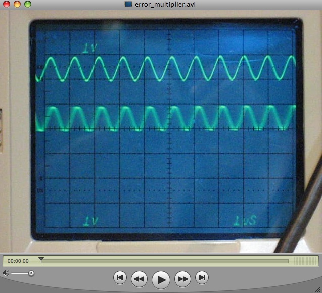 The short video clip on the left side shows the repaired error multiplier in operation. The top trace shows the 1 MHz reference signal while the bottom trace shows the output of the error multiplier with its frequency difference multiplied by ten. |
