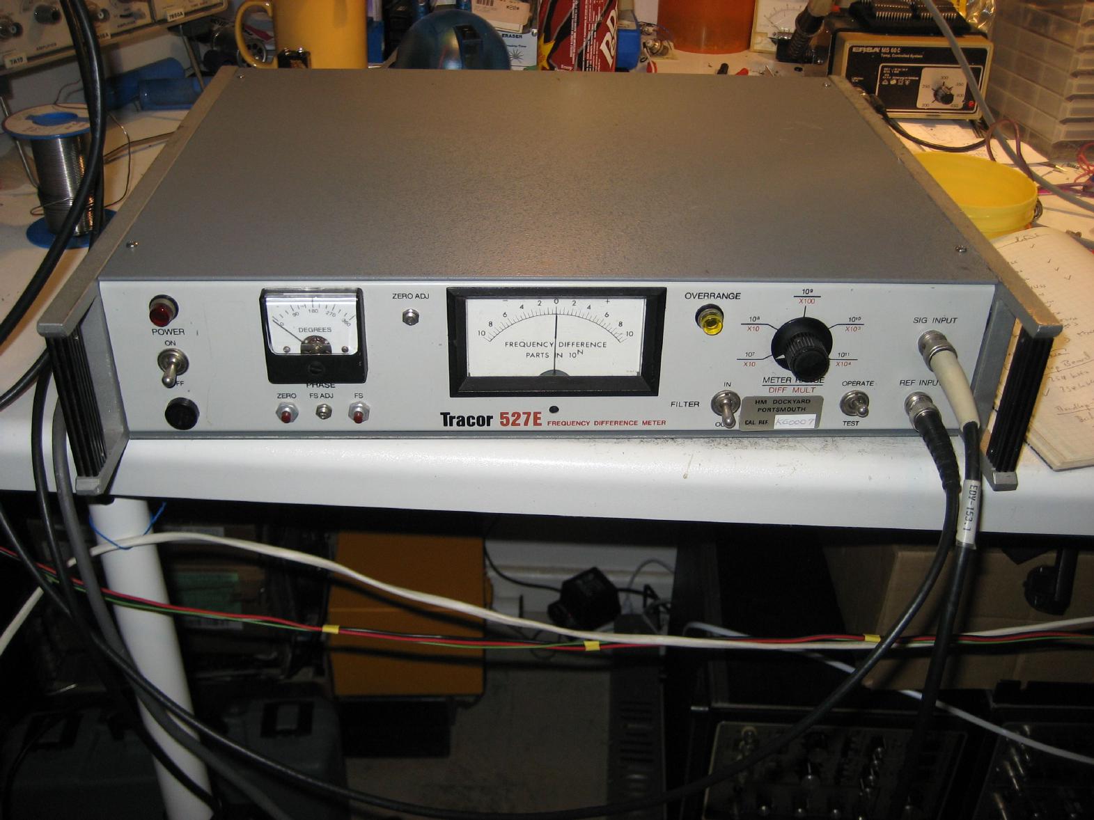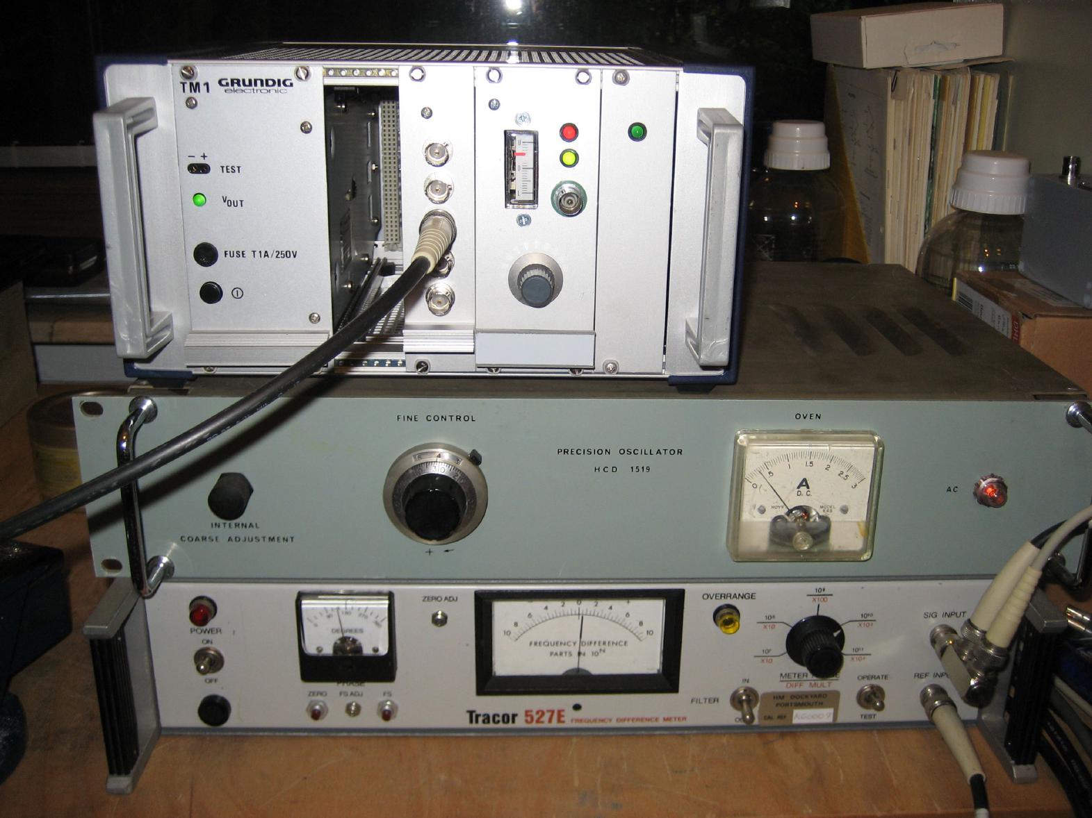 The picture on the right shows the Tracor 527E in operation. On top of stack is the Rubidium oscillator which serves as my master oscillator. Below this is a HCD 1519 precision oscillator which I found on a scrap yard and bought for a couple of EUR. This is a quite bulky oven controlled quartz oscillator which I repaired a couple of weeks ago (broken power supply, missing oven current instrument). On the bottom is the Tracor 527E. As you can see, the HCD 1519 has already warmed up (oven current is well below 0.5 Ampere) and the frequency differency between it and the Rubidium oscillator is better than 0.5 parts in 10 ** 10. |