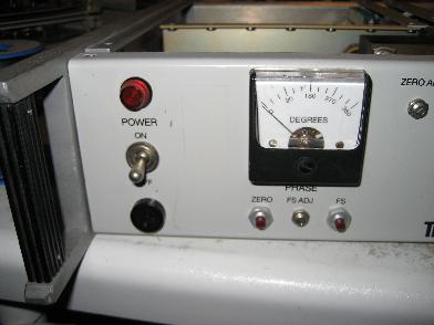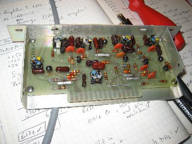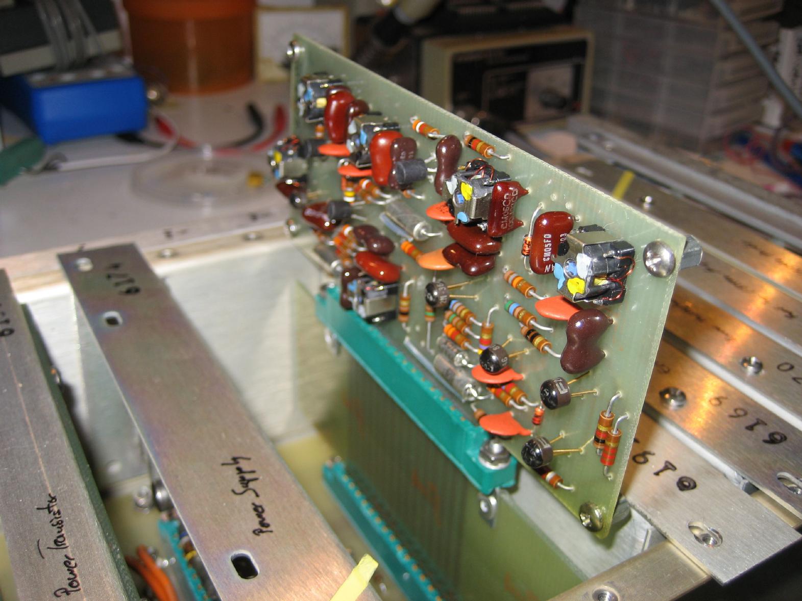 The picture on the left shows the defective error multiplier on top of an extender board which was part of the Tracor 527E (I wish today's manufacturers would sell extender boards etc. with their devices - it would not be too expensive and it would make everybody happy who has to repair the device some day). As it turned out a single transistor in the mixer stage was defective. After replacing it, the error multiplier chain worked like a charm. The next problem that showed up was a very erratic display on the phase instrument. Unfortunately this was controlled by the only board I did not have the schematics for. :-) Fortunately it turned out to be caused be a bad solder joint and was fixed in a couple of minutes. |