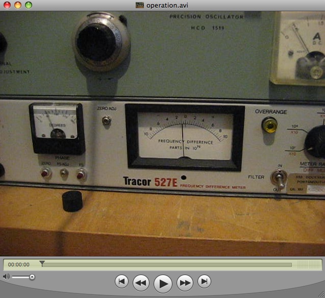 The short video clip on the right shows the instrument in operation. It compares the outputs of the Rubidium oscillator and the HCD 1519 precision quartz oscillator which is not yet up to temperature (as can be seen by the oven current which reads about 0.5 A). The frequency difference is already below 0.5 parts in 10 ** 7, but the phase meter on the left shows the phase difference between the reference signal and the output of the first error multiplier. |